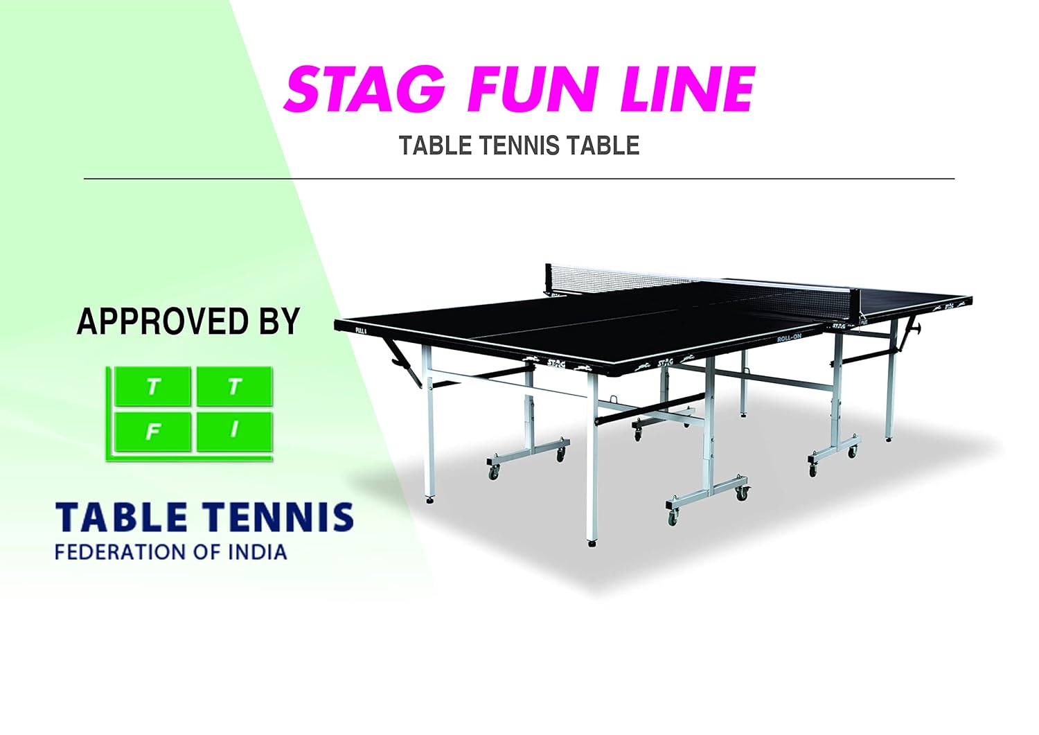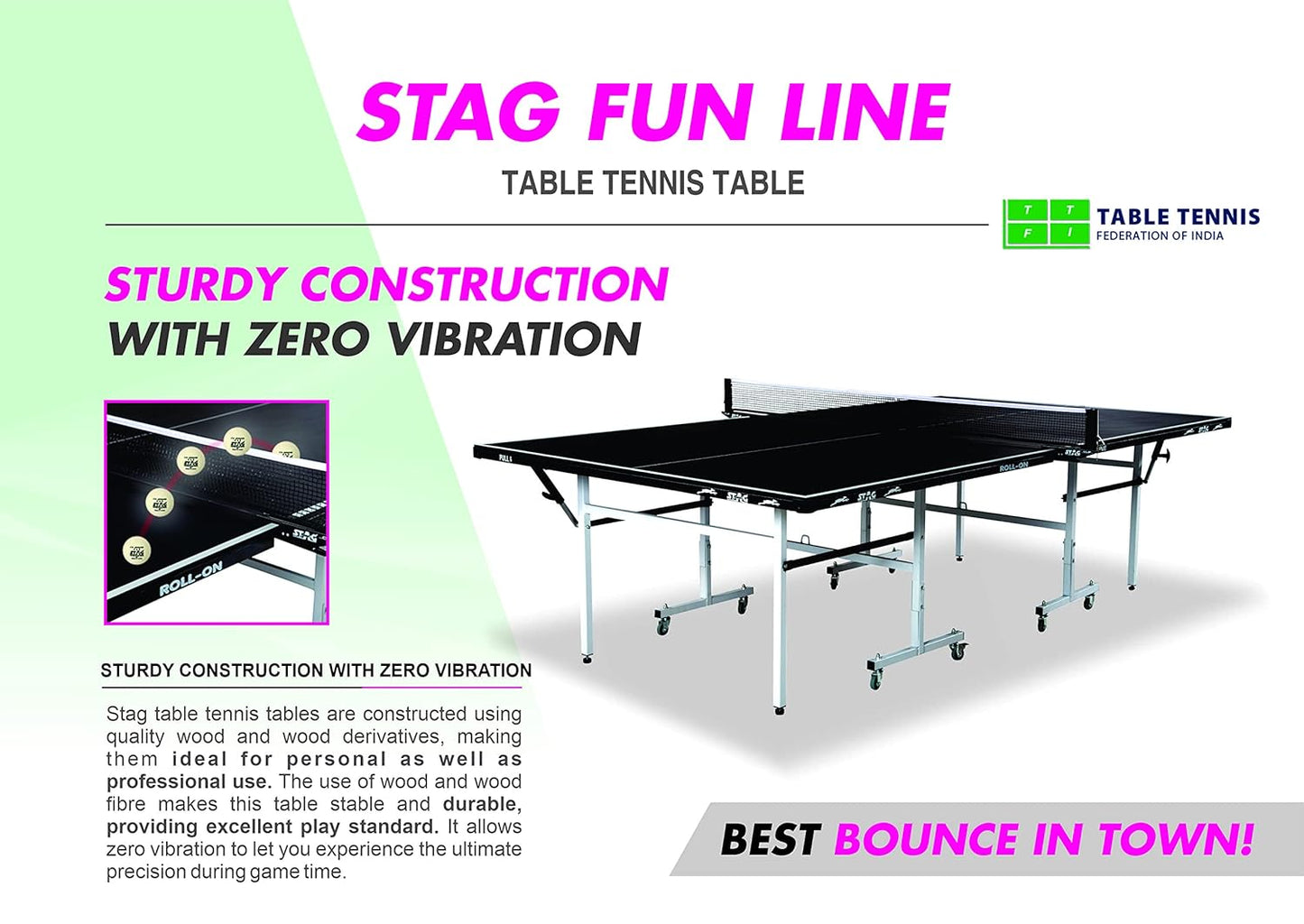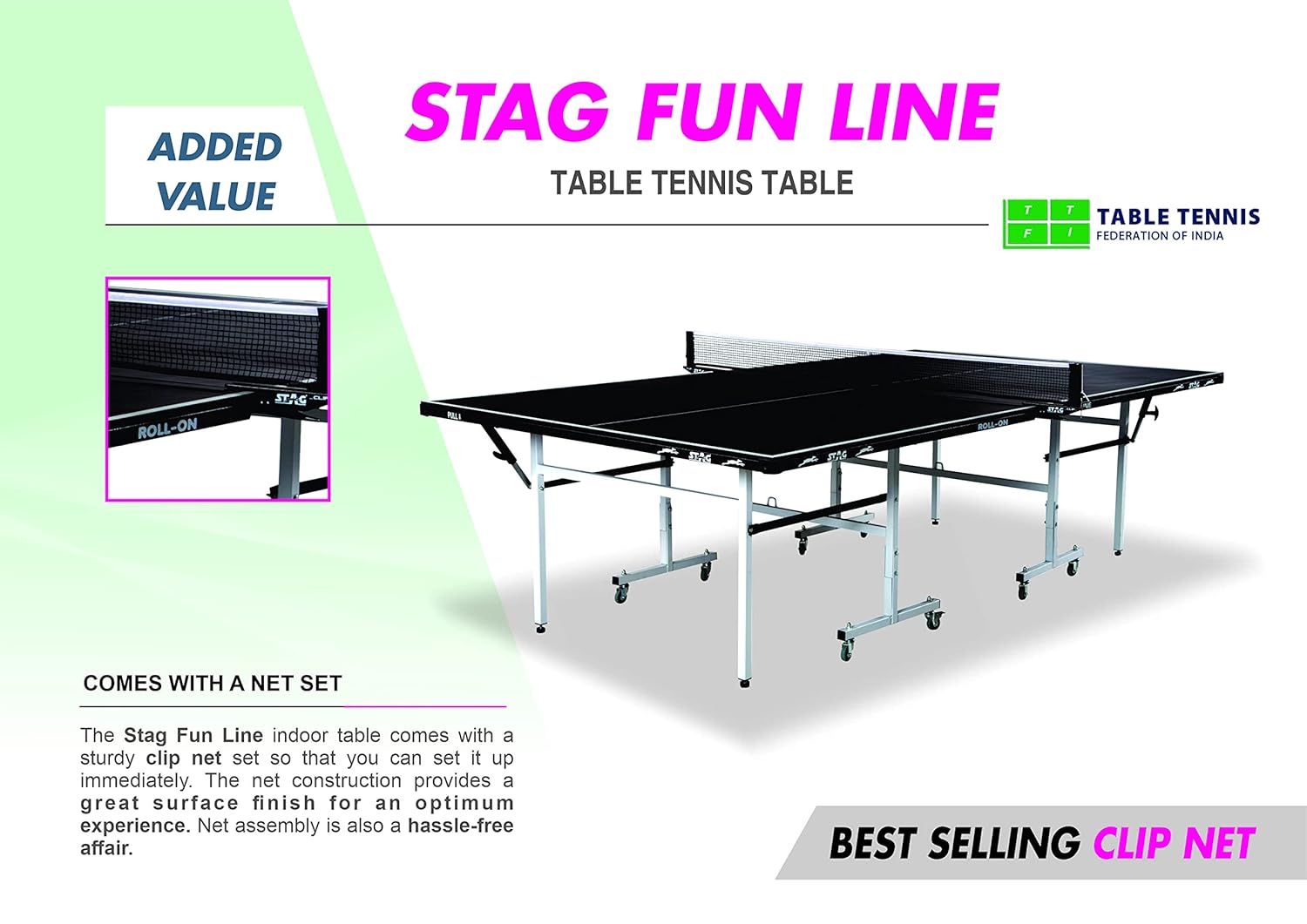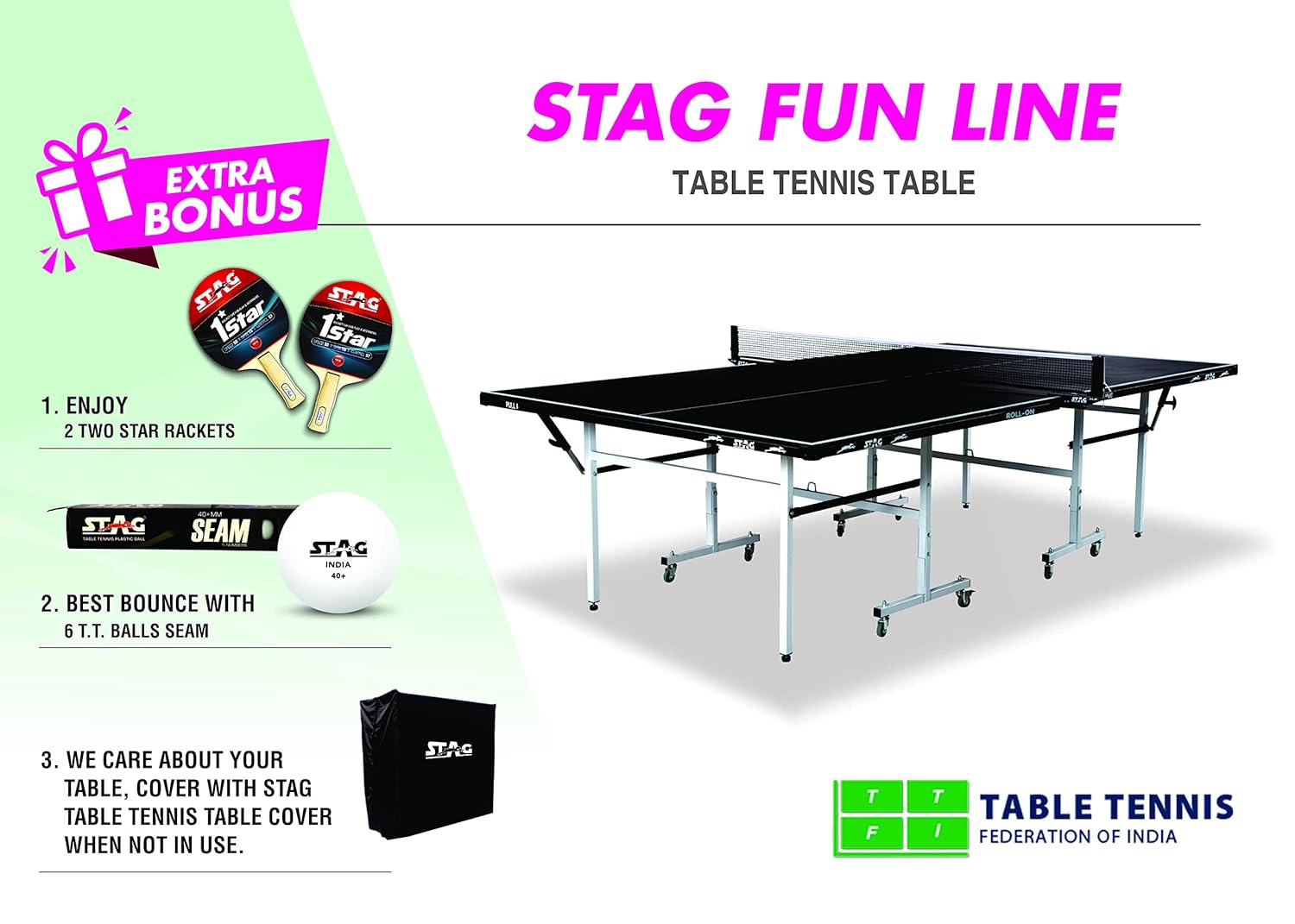STAG GLOBAL Fun Line Enjoy quick assembly and hours of fun with this full-size professional table. Features include a 7-minute setup, single-player playback mode, and includes 1 table cover, 2 rackets, 6 balls, and a clamp net.