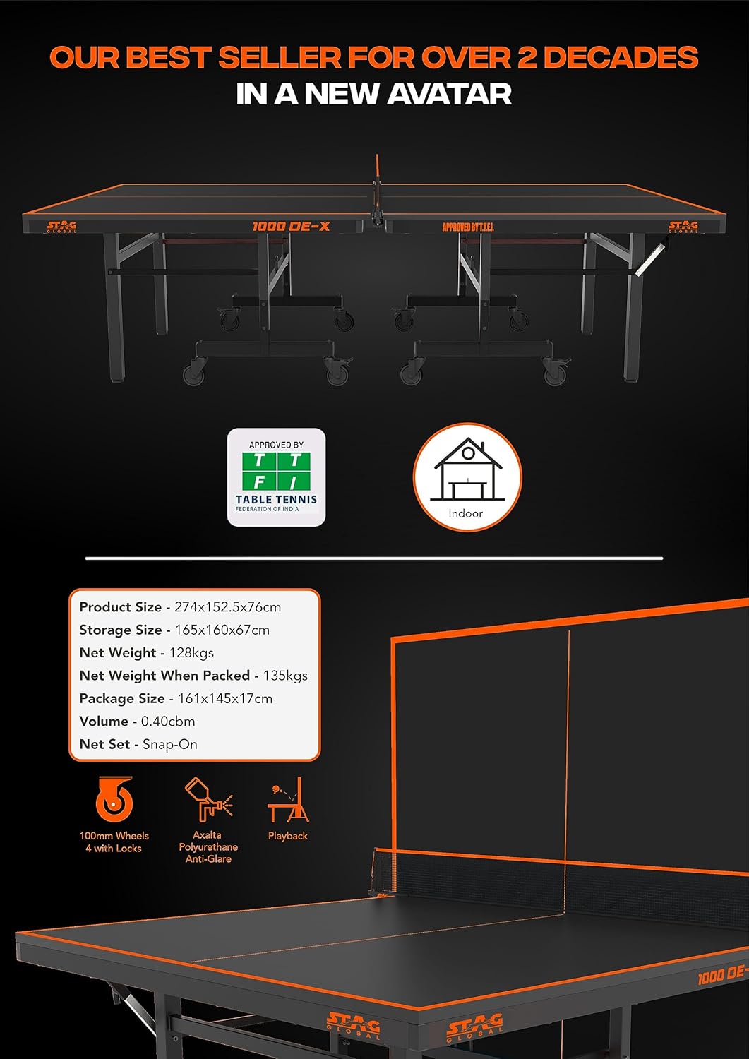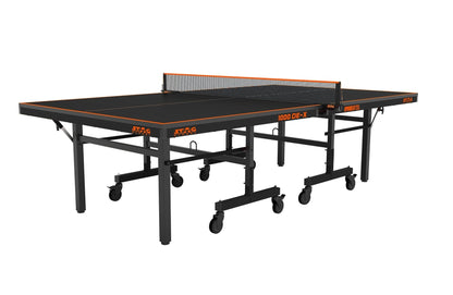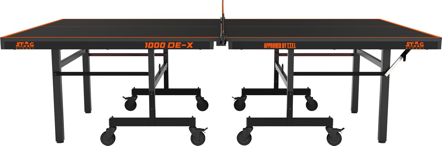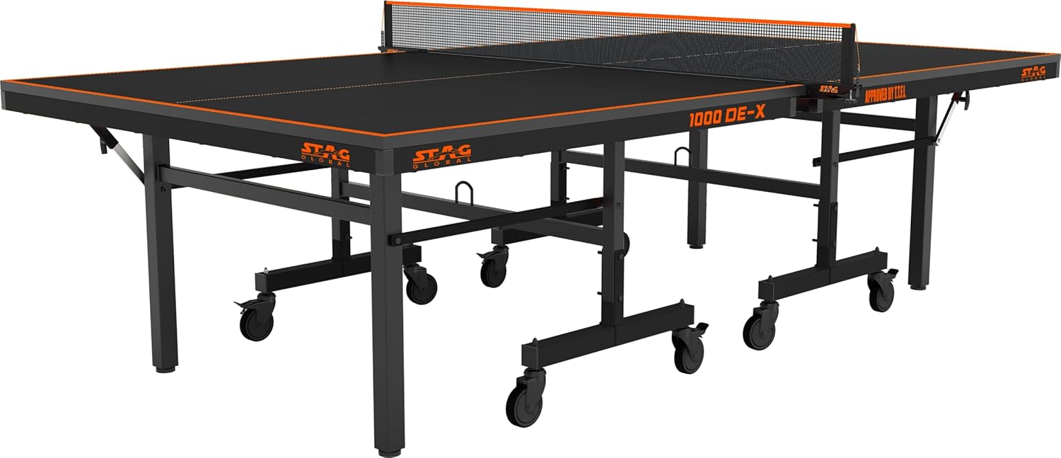 The STAG GLOBAL 1000 DE-X Table Tennis Table is a professional-grade indoor table designed for competitive and recreational play. Featuring a 25mm laminated particleboard top with DuPont polyurethane anti-glare coating, it ensures consistent bounce and optimal visibility. The robust 25 x 50mm heavy-duty steel frame, combined with eight 100mm caster wheels (four with locks), offers stability and mobility.