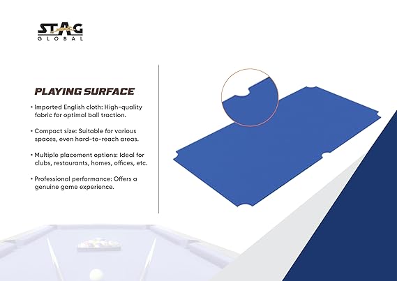 The STAG GLOBAL 3-in-1 Multi-Game Table is a premium and versatile addition to any home, combining a pool table, table tennis table, and dining table in one smart design. Built with a durable 12mm solid plywood frame and sturdy wooden legs, it offers excellent stability and long-lasting performance. The 18mm MDF laminated surface ensures a smooth and professional playing experience, while the standard 8 ft × 4 ft playing area makes it ideal for both beginners and experienced players. With overall dimensions of 265 × 147 × 83 cm and a solid 160 kg weight, the table is designed for balance and durability. It comes with a complete set of accessories including 16 pool balls, 2 wooden cues, triangle, cue chalks, composite cue, and brush, so you can start playing right away. The table also features a convenient conversion top, allowing you to easily switch between games or use it as a dining table, making it perfect for entertainment, sports, and everyday use. Available in two variants—Cut Out Legs (Model 1) and Broad Legs (Model 2)—this table blends functionality with style. Kindly allow up to 2 weeks for manufacturing, as quality craftsmanship takes time and ensures a product worth the wait.
