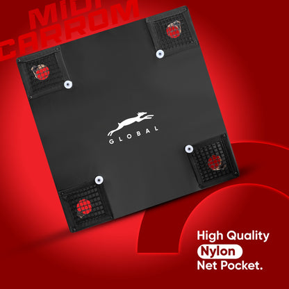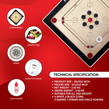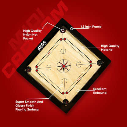 Experience smooth gameplay with the STAG GLOBAL Midi Carrom Board Set (20x20 X1.5 Inch), perfect for indoor fun with family and friends. It features a glossy surface, sturdy 1.5-inch frame, and comes complete with 6 white coins, 6 black coins, 2 red queens, 1 striker, disco powder, and an instruction manual. Durable and made in India!