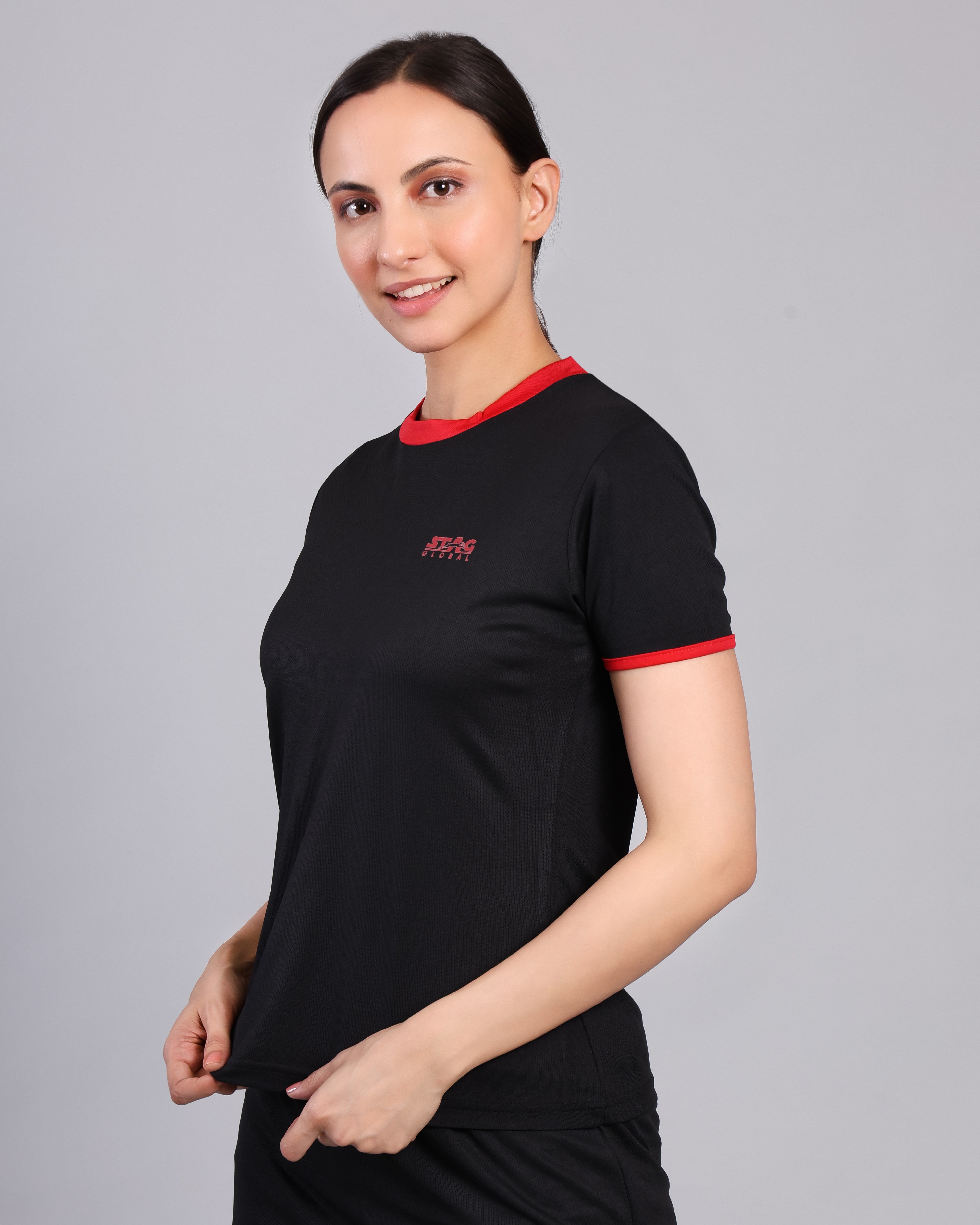 Made from soft, breathable fabric, this performance T-shirt ensures lasting comfort and ease of movement. The striking red detailing on the collar and sleeves adds a touch of sporty elegance—ideal for training sessions, tournaments, or everyday active wear.