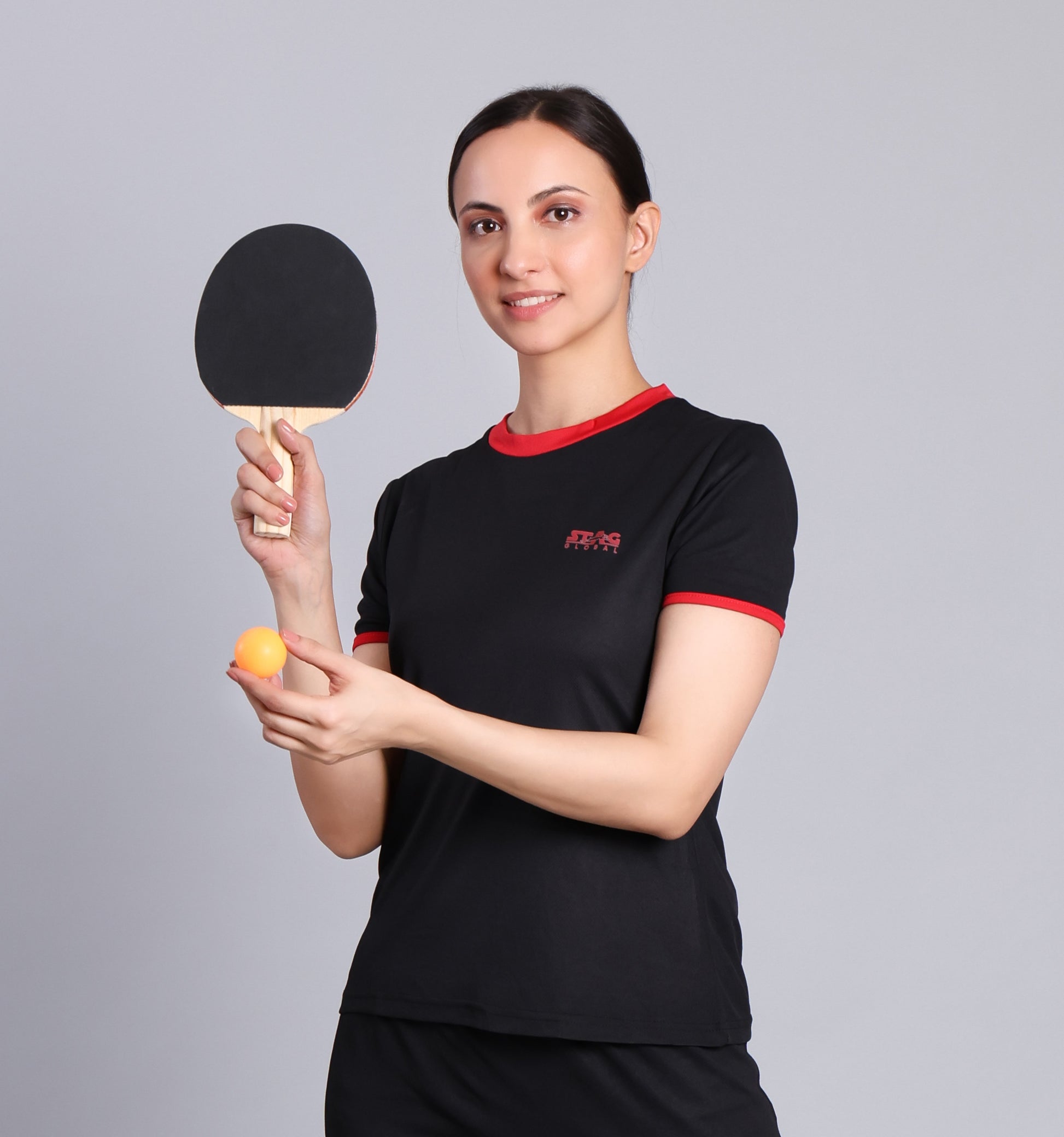 Crafted from lightweight, breathable fabric, this athletic T-shirt offers all-day comfort and flexibility. Designed with a bold red collar and sleeve edges, it combines sporty performance with modern style—perfect for table tennis practice, workouts, or casual wear.