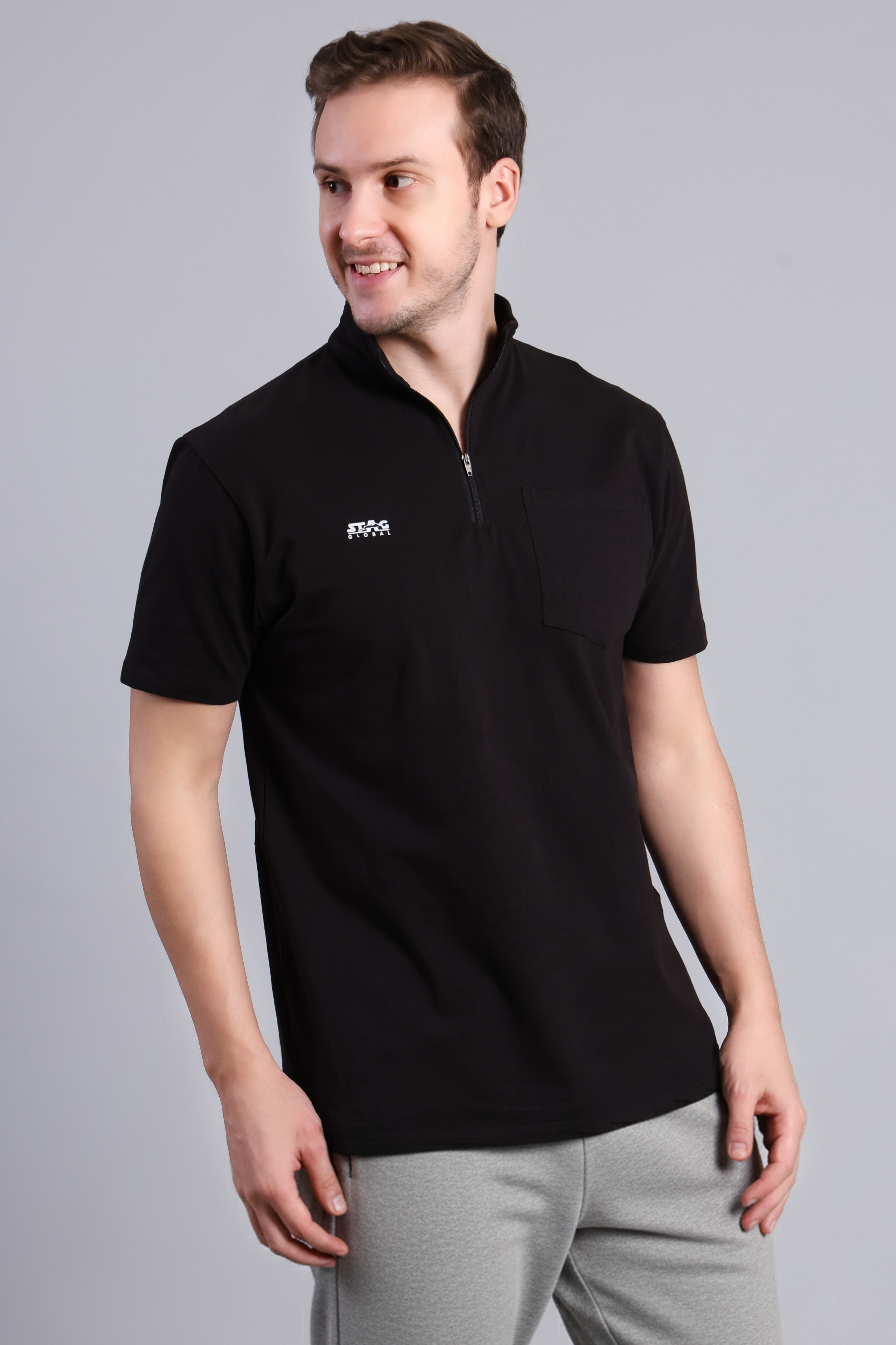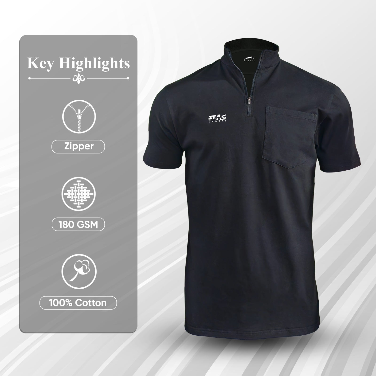 STAG GLOBAL Hustle 100% Cotton Zipper T-Shirt with Pocket | Half Sleeve, 180 GSM, Pocket Design