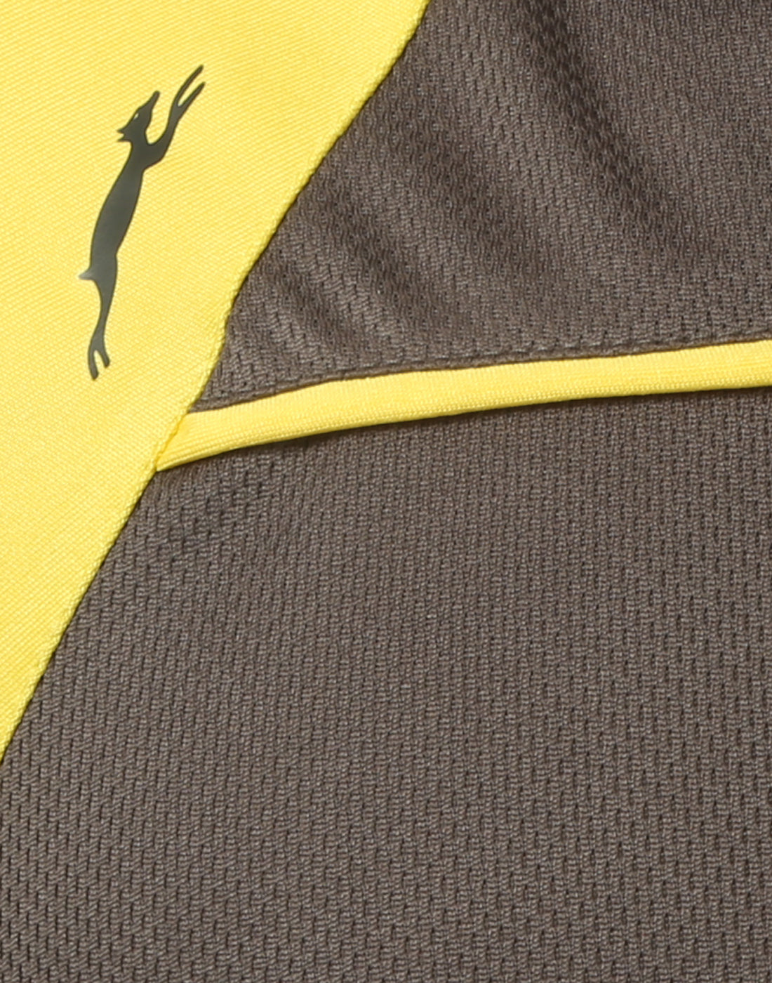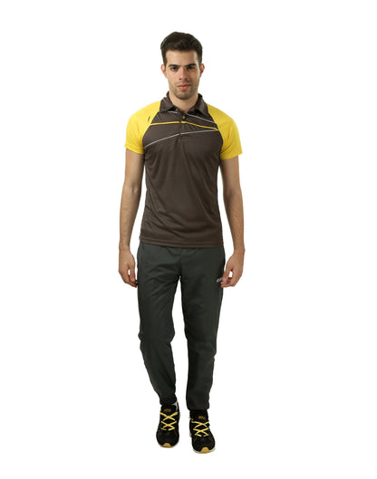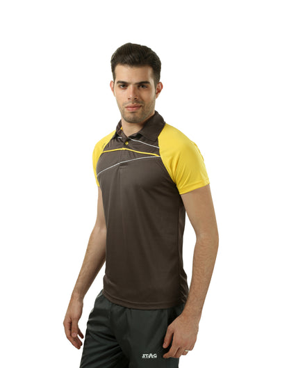 the Repeat Dark Grey Polo T-shirt from Stag Global. Featuring a dynamic yellow-shoulder contrast and sporty graphic detailing, it’s engineered for peak performance and standout style.
