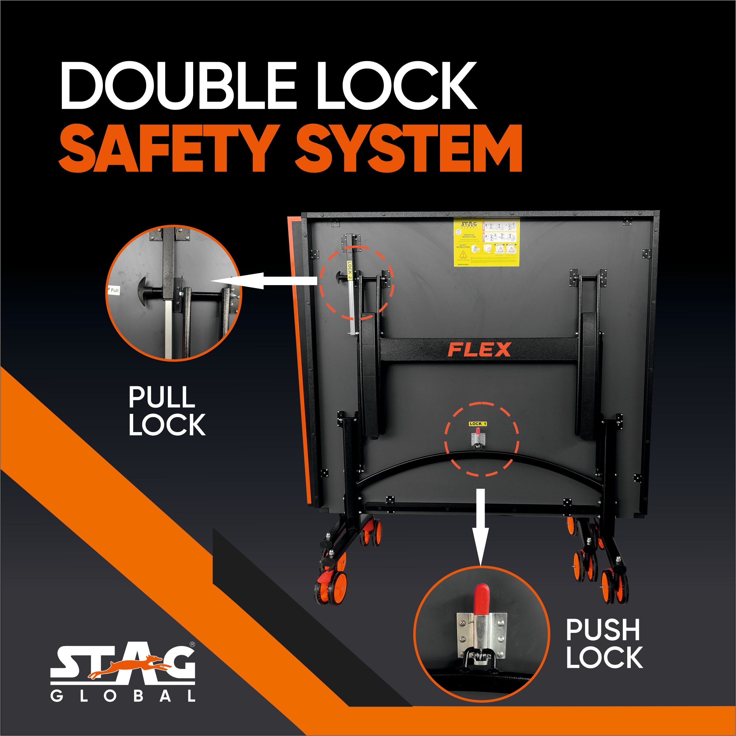 The STAG GLOBAL Flex Tennis Table – Premium Black Top 25 mm is a professional-grade table tennis setup designed for both home and club use. It features a 25mm thick black table top for consistent bounce and durability.
